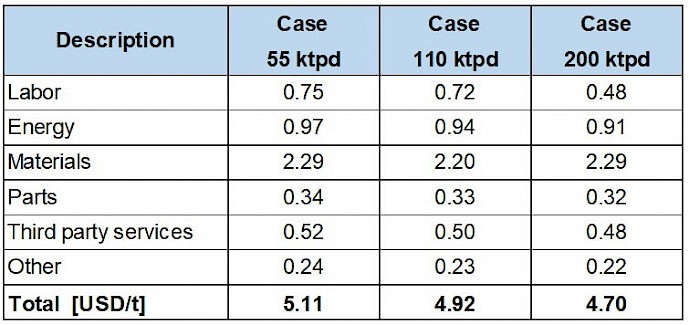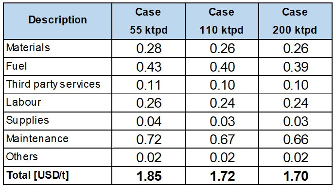 For all cases an Infrastructure cost of 0.2 USD/t was assumed, which includes labour, energy, materials, spare parts and third-party services.