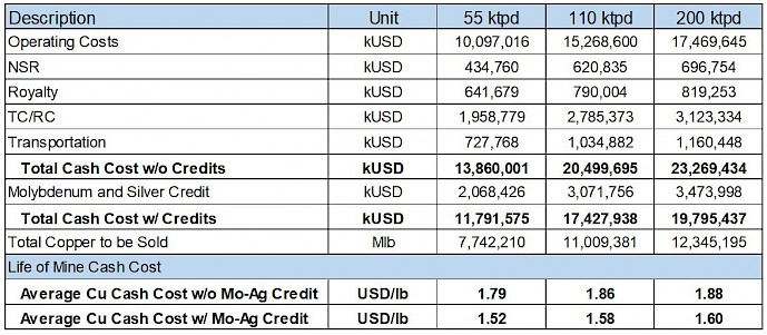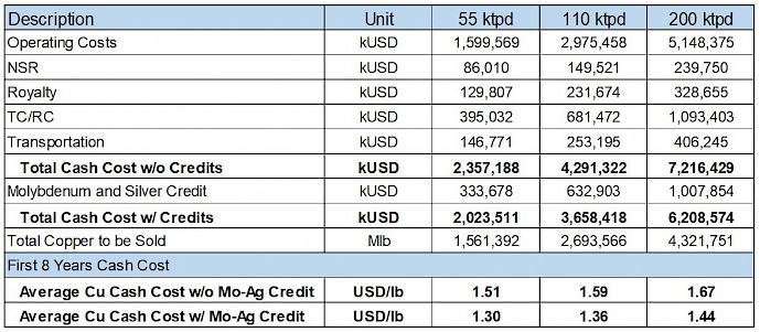 C1 Cash Cost (net of by-product credits) of US$ 1.36/lb for first 8 years of operation; US$ 1.58/lb for LOM