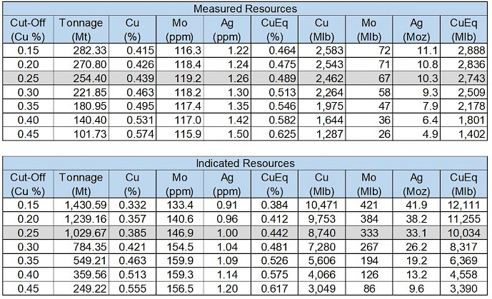 1,284 million tonnes of Measured and Indicated Resources with a 0.45% CuEq grade and 0.40% Cu grade (at 0.25% Cu cut-off grade)