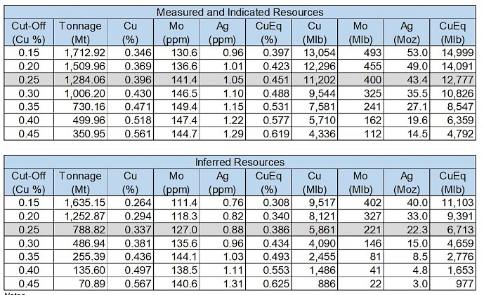 The tables below present a sensitivity analysis for the mineral resources under different cut-off grades. The base case for the estimation of resources is 0.25% Cu.