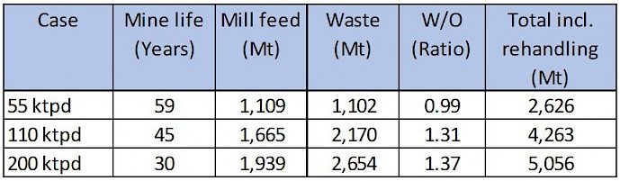 The following table summarizes the material moved for each case, including miil feed, waste and the re-handling of stockpiles.