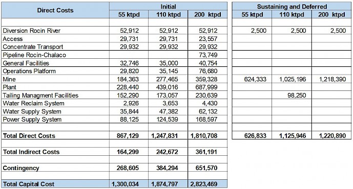 The following table summarizes the initial, sustaining and deferred capital requirements of the Vizcachitas Project for the different development cases.
